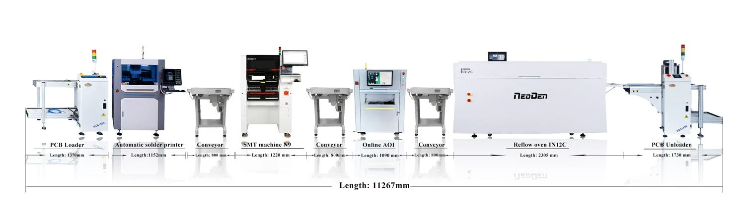 PCB Loader + Otomatik krem lehim baskı makinesi + Konveyör + N9 SMD Dizgi Makinesi + Konveyör + AOI makinesi + Konveyör + Reflow Fırın IN12C + PCB Unloader